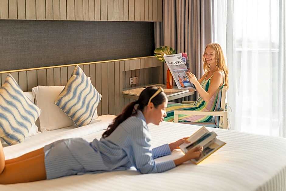 The spacious twin/double room provides air conditioning, a seating area, a balcony with pool views as well as a private bathroom featuring a walk-in shower.